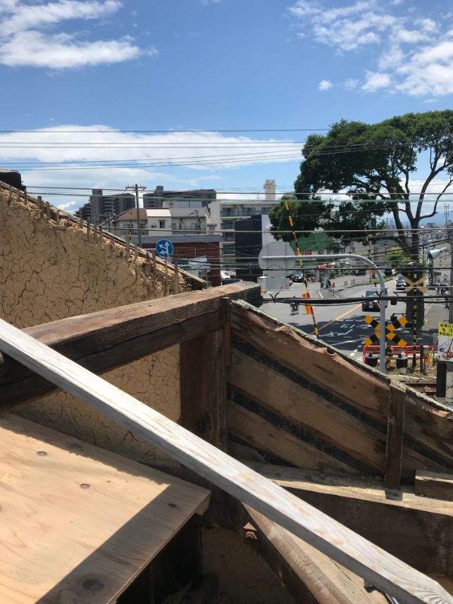 まずは台風で屋根が吹っ飛んだ時に、応急処置で張ってもらったブルーシートを剥がしていきます。紫外線にずっと当たっていたので、部分的にボロボロです…