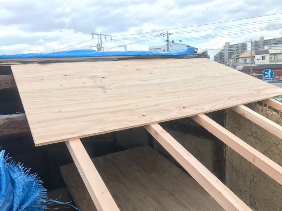 まずは野地板を3枚ぐらい並べて張れるであろうスペースのブルーシートを剥がしていきます。この作業で1時間半ぐらいかかりました。
