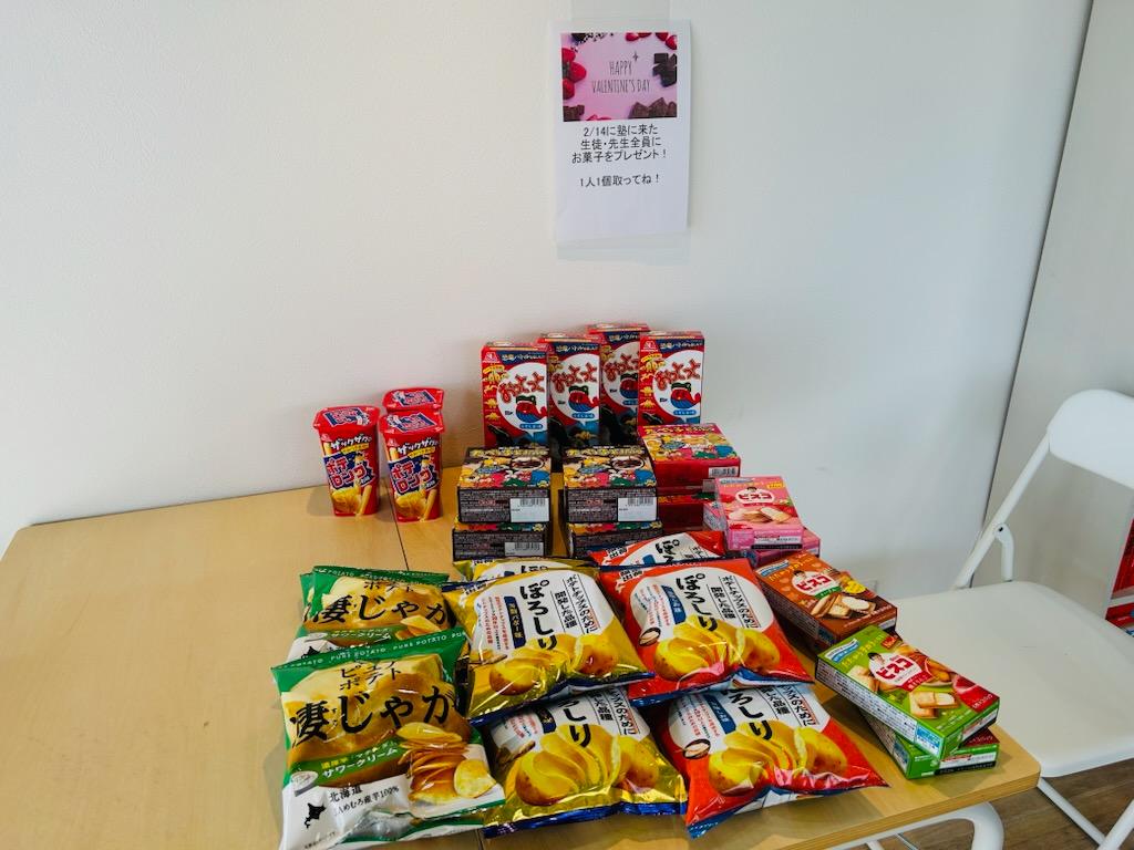 2/14の前日、つまり2/13の晩に僕厳選のお菓子を大量に購入してきました!そしてこのように、入り口の机の上にズラっと並べました!